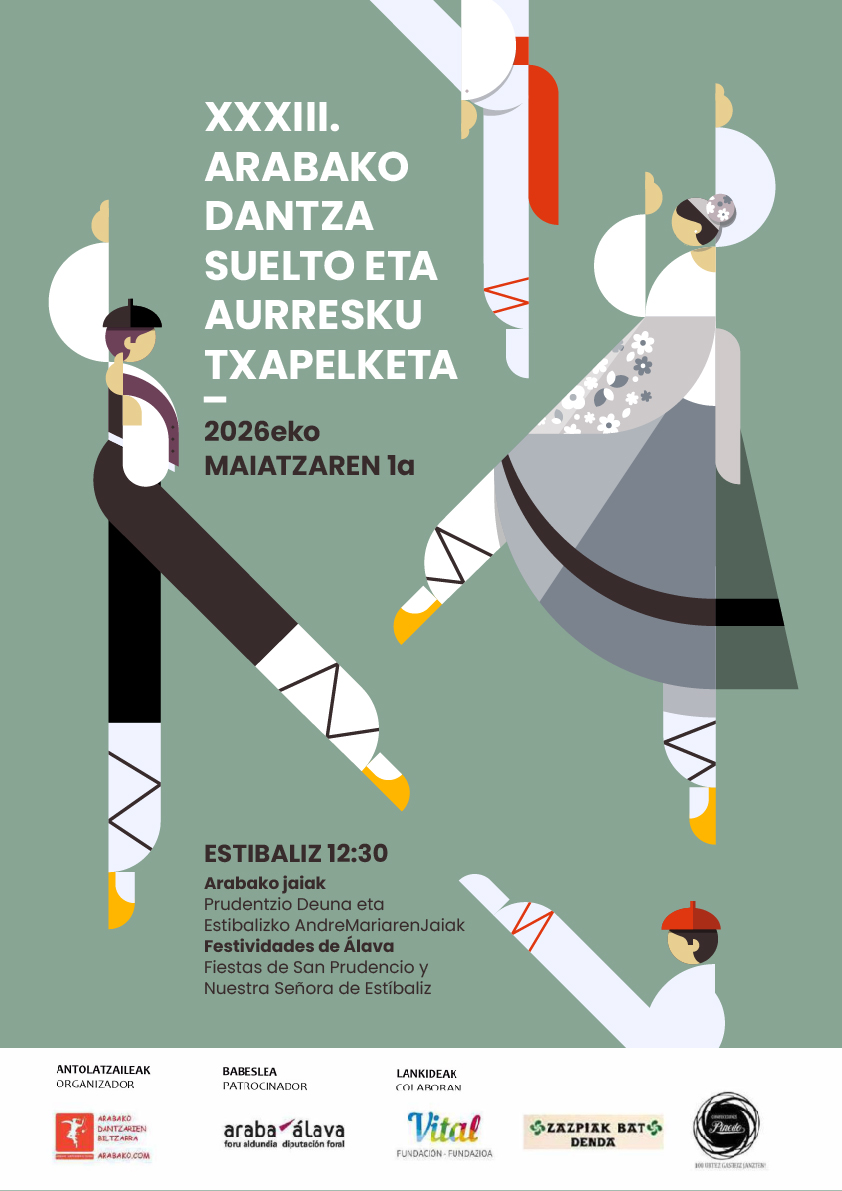 Arabako Dantzarien Biltzarrak, “XXXIII. ARABAKO DANTZA SUELTO ETA AURRESKU TXAPELKETA” kartel lehiaketarako deialdia zabaldu nahi du, 2026eko maiatzaren 1ean Estibalizen ospatuko den dantza suelto eta aurresku txapelketarako.